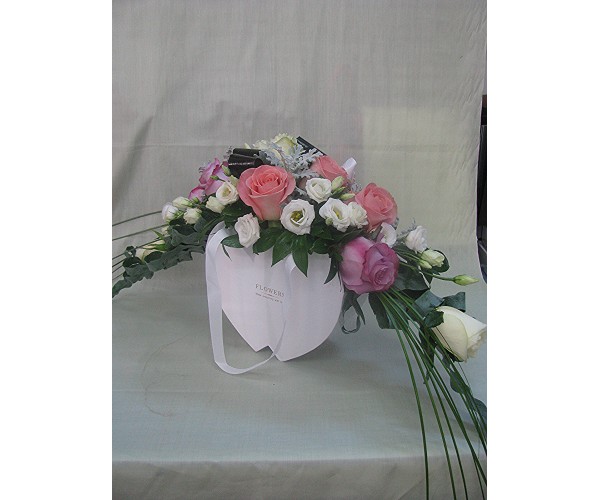 Кутия с цветя и празнични балони.