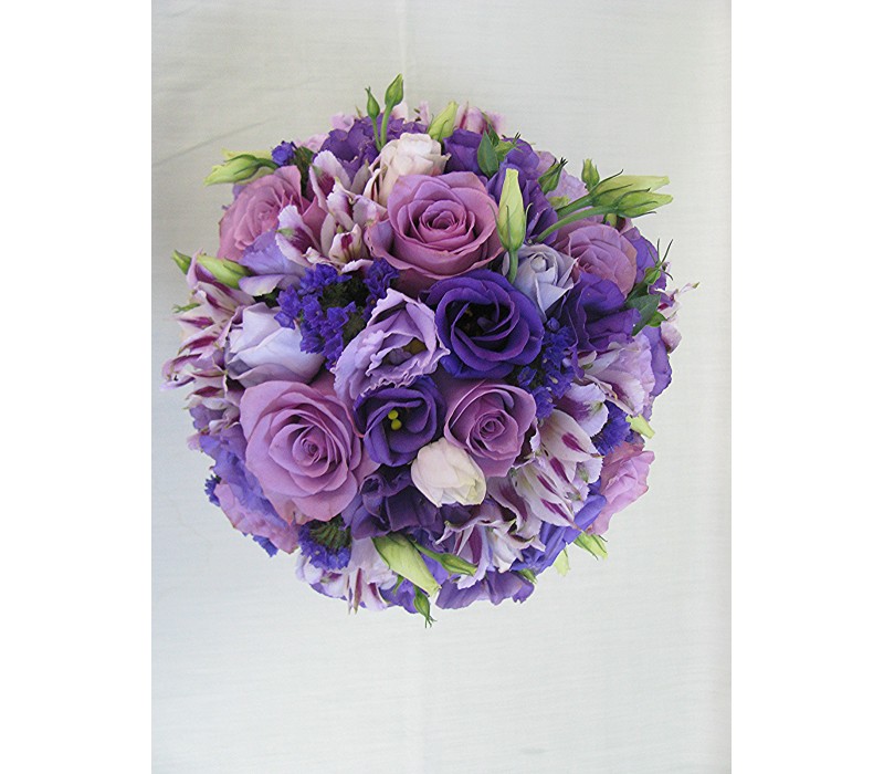 Нежен букет с рози, алстромерия и еустома аранжиран с листа аралия