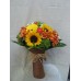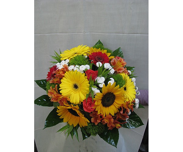 Пъстроцветен букет със слънчогледи, гербер, мини гербер, алстромерия, рози и хризантема сантини