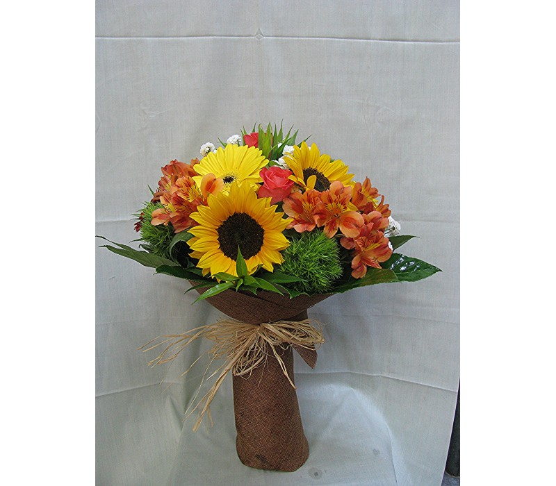 Цветен букет със слънчоглед, гербер, рози и алстромерия