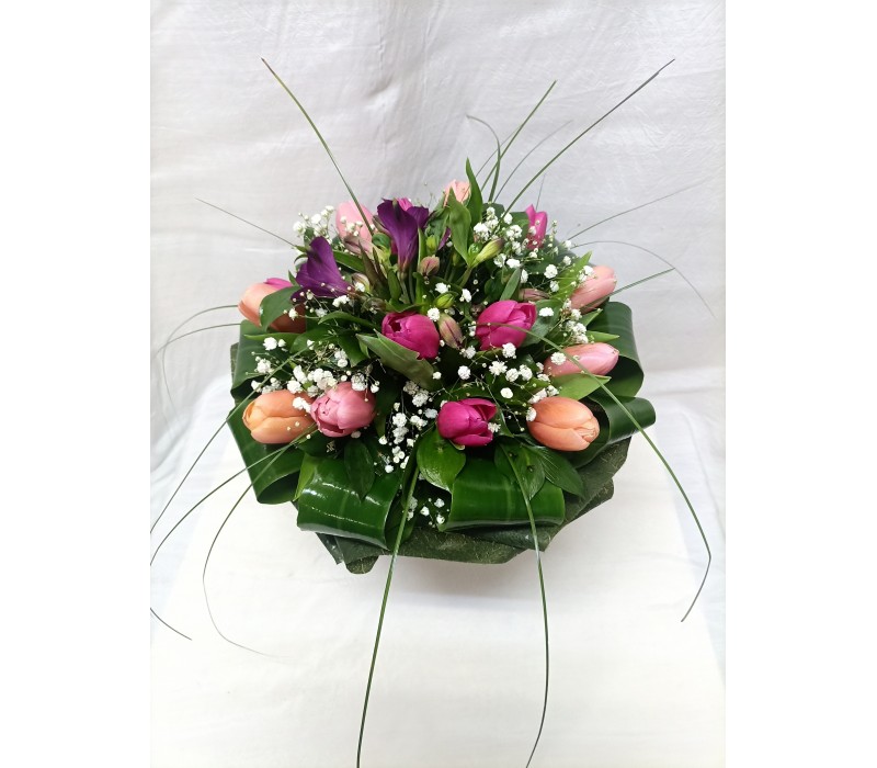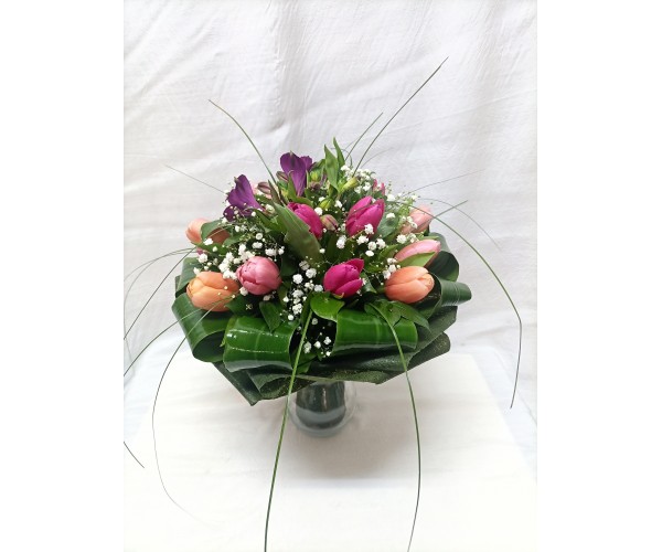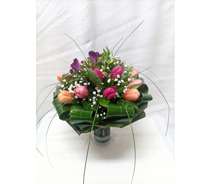Пъстроцветен пролетен букет с 21 стръка лалета, гипсофил и нежна зеленина