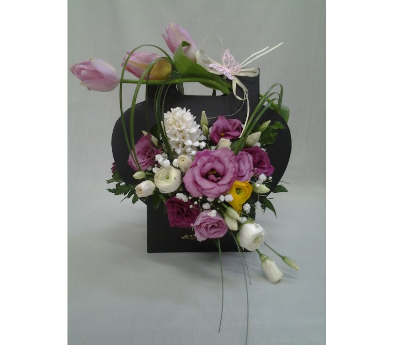 Кутия с цветя и празнични балони.