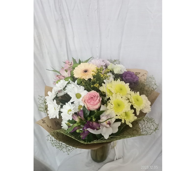 Пъстроцветен букет от рози, алстромерия, орхидея , хризантема и гербер, обгърнат с мрежа и крафт хартия.
