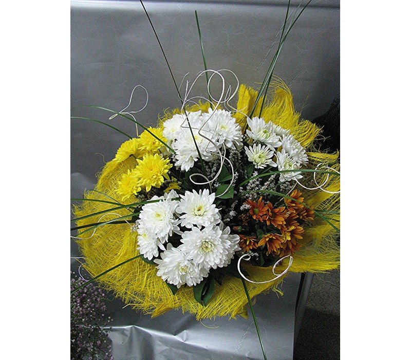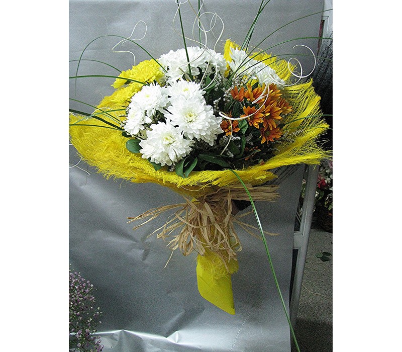 Пъстроцветен букет с хризантеми, аранжиран с гипсофил, берграс и нежна зеленина.