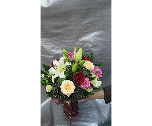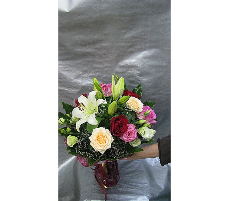 Пъстроцветен букет с лилиум, рози и еустома, аранжиран с листа аспидистра , аралия и гипсофил.