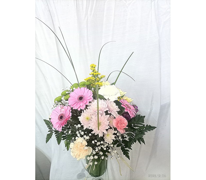 Пъстроцветен букет във ваза от хризантеми, гербер и карамфил 19 стръка цветя.