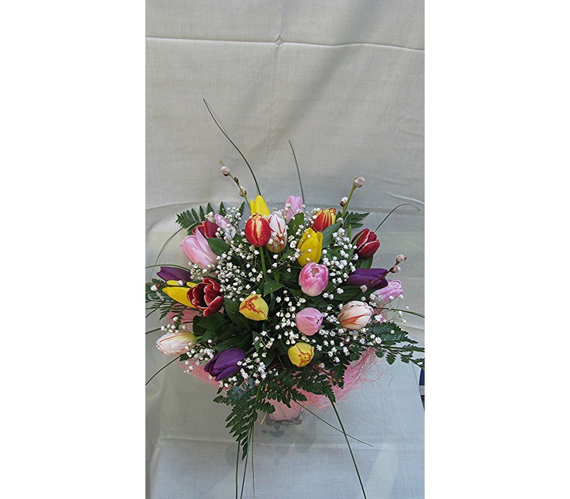 Пъстроцветен пролетен букет с 35 стръка бели, розови и жълти лалета.