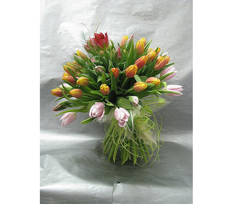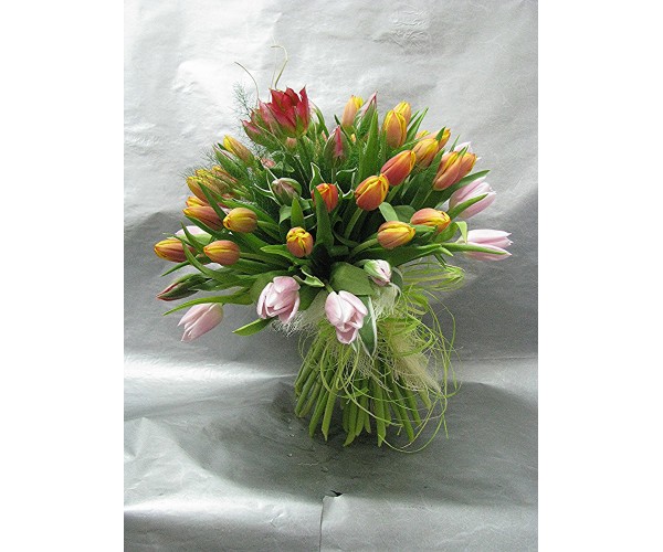 Пъстроцветен пролетен букет с 51 стръка лалета, нежна зеленина , привързан с естествена кора и рафия.