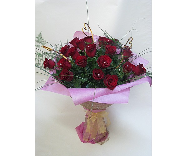 Букет с 19 стръка прекрасни червени рози обгърнати от натурално зебло.