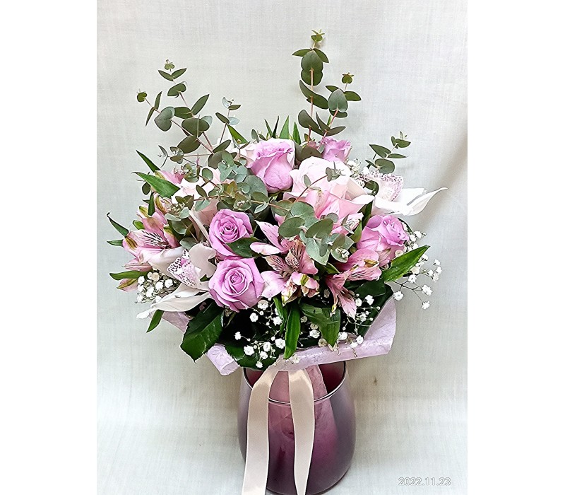 Нежен букет с рози, алстромерия и еустома аранжиран с листа аралия