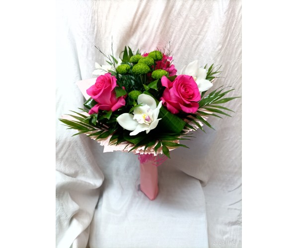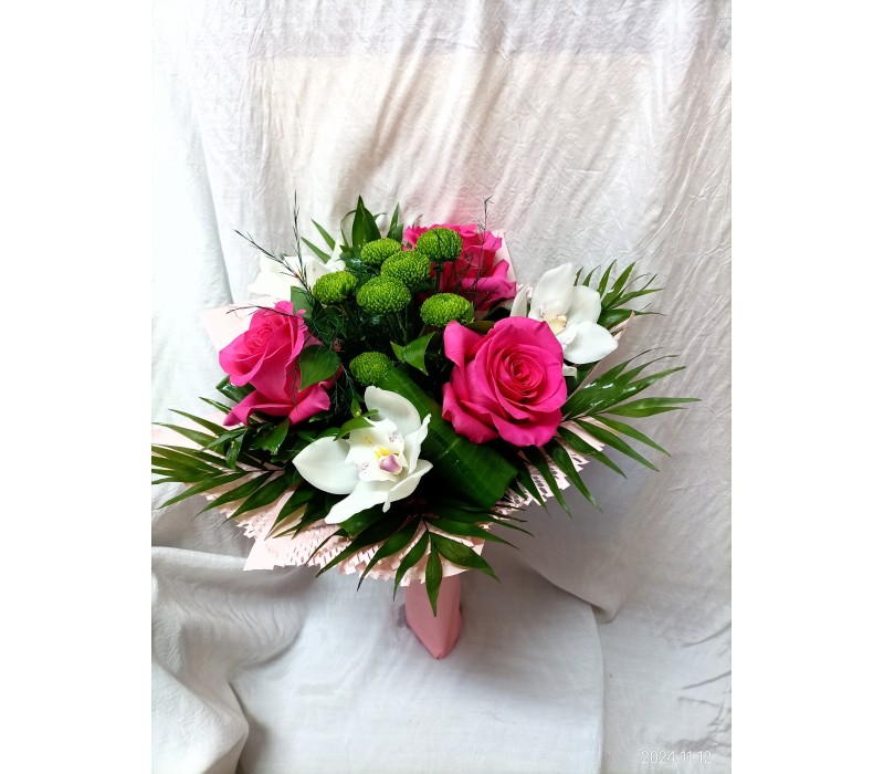 Стилен букет от рози, орхидея и хризантема.