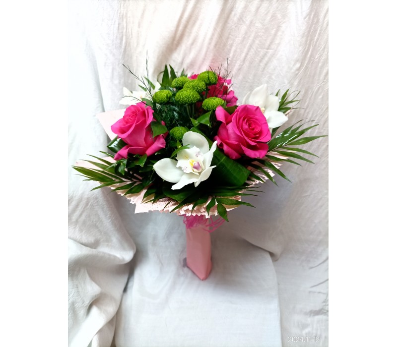 Букет микс от рози, гербер, еустома, орхидея и матиола.
