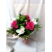 Нежен букет с рози, алстромерия и еустома аранжиран с листа аралия