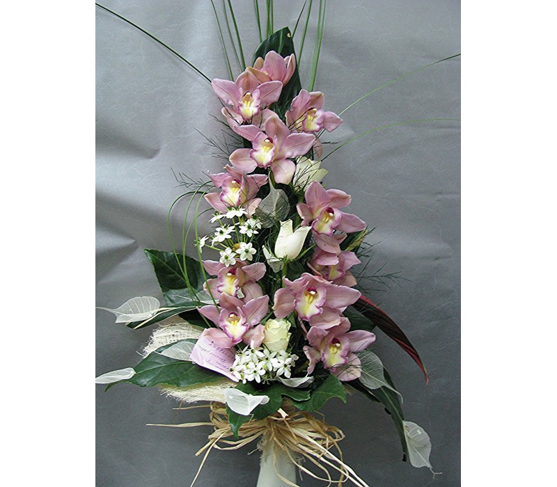 Стилен букет с орхидея цимбидиум, аранжиран с листа корделине , аралия и гипсофил.