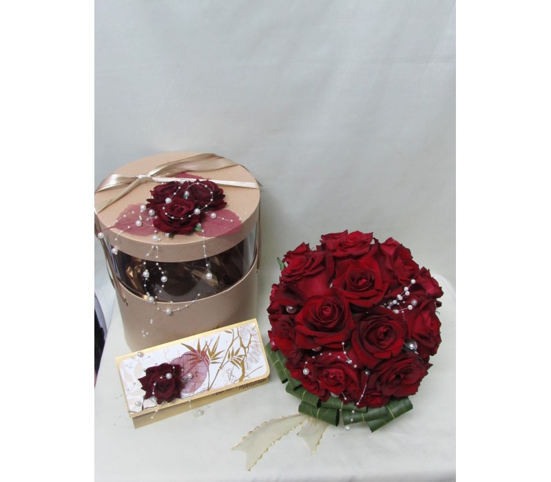 Кутия с рози и празнични балони.