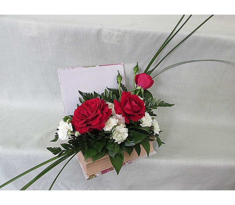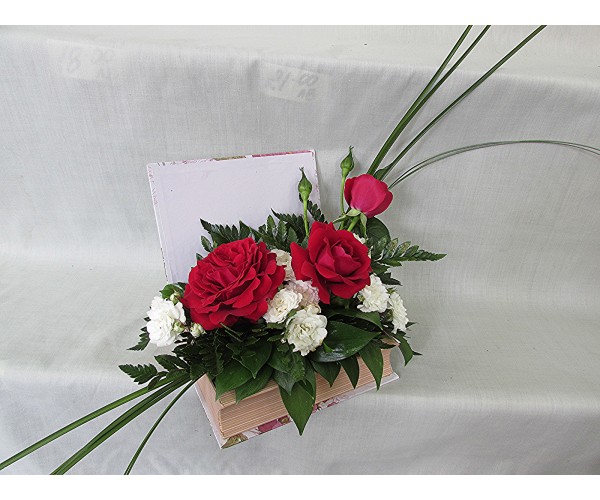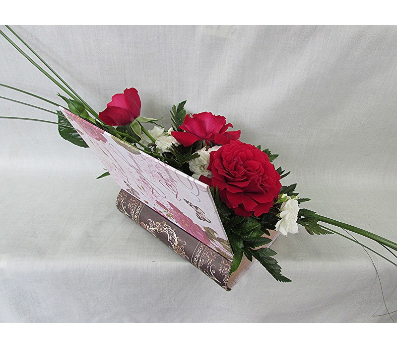 Три броя прекрасни рози аранжирани в кутия книга.