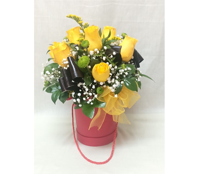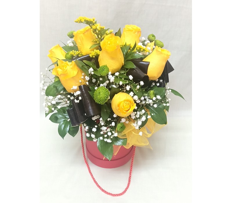Тринадесет жълти рози в комбинация с гипсофила , аранжирани в кутия.