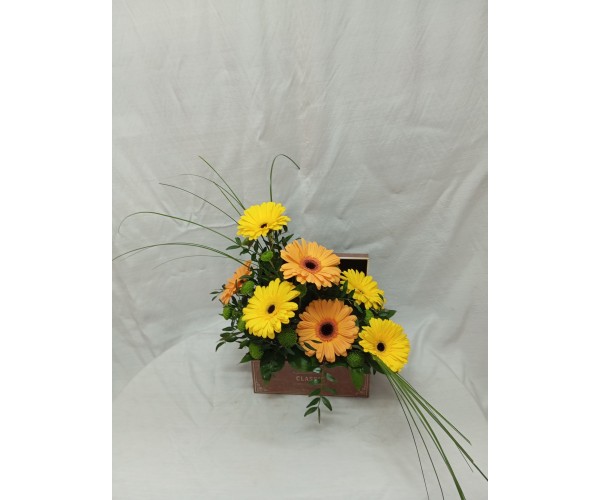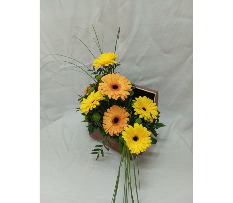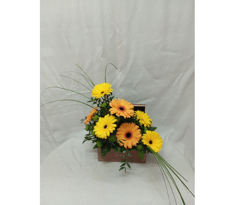 Жълти и оранжеви гербери, аранжирани в стилна кутия.